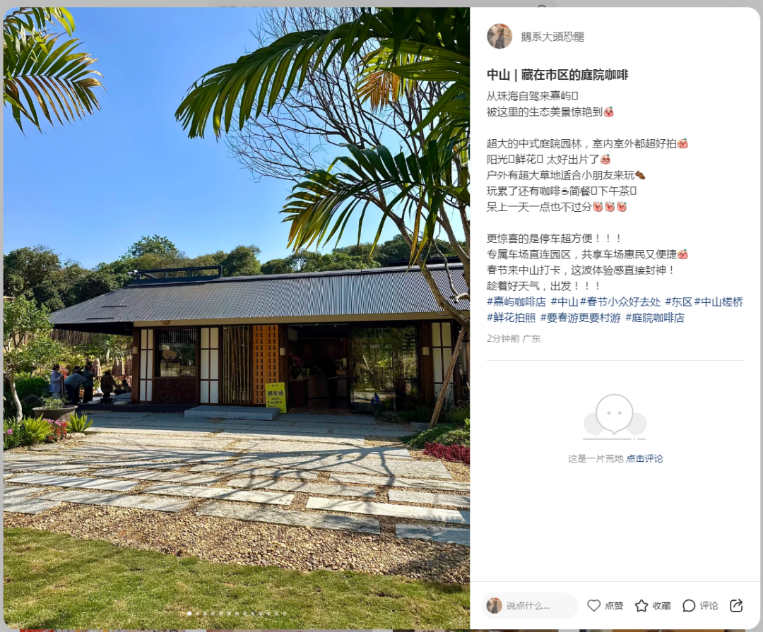外地自驾游客@鵝系大頭恐龍:从珠海自驾来熹屿,被这里的生态美景惊艳到,更惊喜的是停车超方便,公园车场直连园区,共享车场惠民又便捷,春节来中山打卡,这波体验感直接封神!
