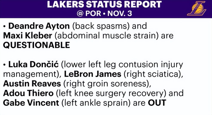在最新的伤病报告上,湖人5位球员被列为缺阵的状态,2人被列为出战成疑——