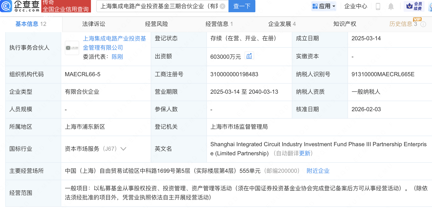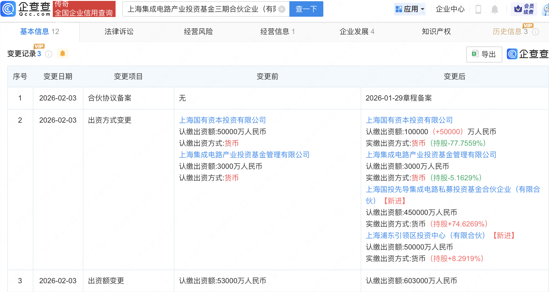 近日,上海集成电路产业投资基金三期合伙企业(有限合伙)发生工商变更,新增上海国投先导集成电路私募投资基金合伙企业(有限合伙)等为合伙人,同时出资额由5.3亿元增至60.3亿元。企查查信息显示,该企业成立于2025年3月,经营范围包含:以私募基金从事股权投资、投资管理、资产管理等活动。